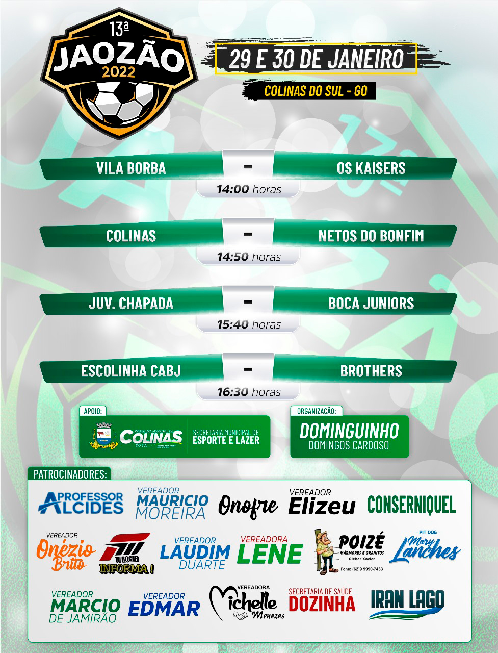 Vem aí a 13ª edição do Jaozão 2022, um dos torneios mais aguardados de Colinas do Sul (GO). O evento acontece nos dias 29 e 30 de janeiro, trazendo emoção e rivalidade entre os times da região.