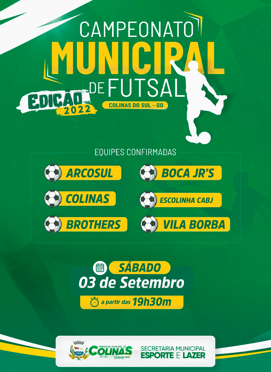 A cidade de Colinas do Sul-GO se prepara para vibrar com a emoção do futsal! Foi divulgado o cartaz oficial do Campeonato Municipal de Futsal, Edição 2022, que promove mais uma edição de um dos eventos esportivos mais aguardados da região.
