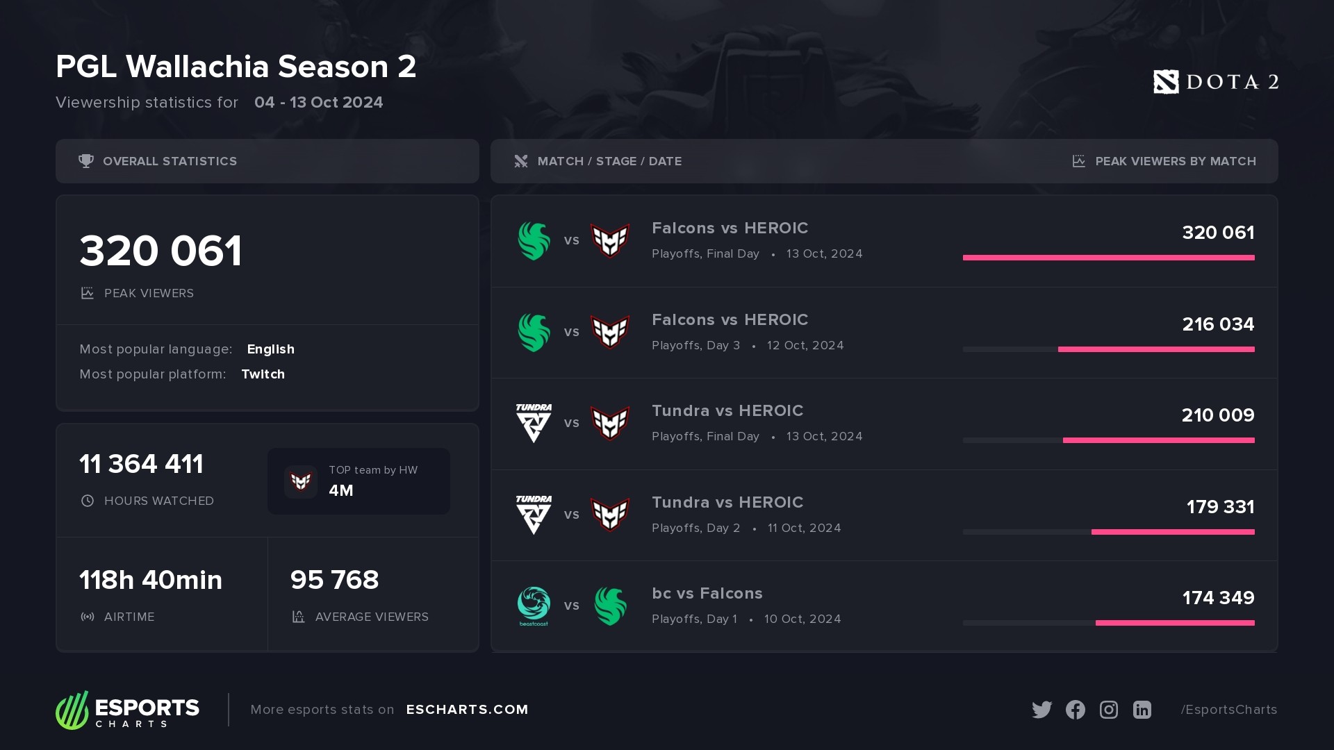 A PGL Wallachia Season 2 registrou 320K Peak Viewers durante a Grand Final, o que trouxe a vantagem adicional da Heroic buscando corrigir sua derrota anterior para a Team Falcons na Upper Bracket Final. O evento também registrou 11,36M Hours Watched e 95,77 Average Viewers em 119 horas de transmissão.